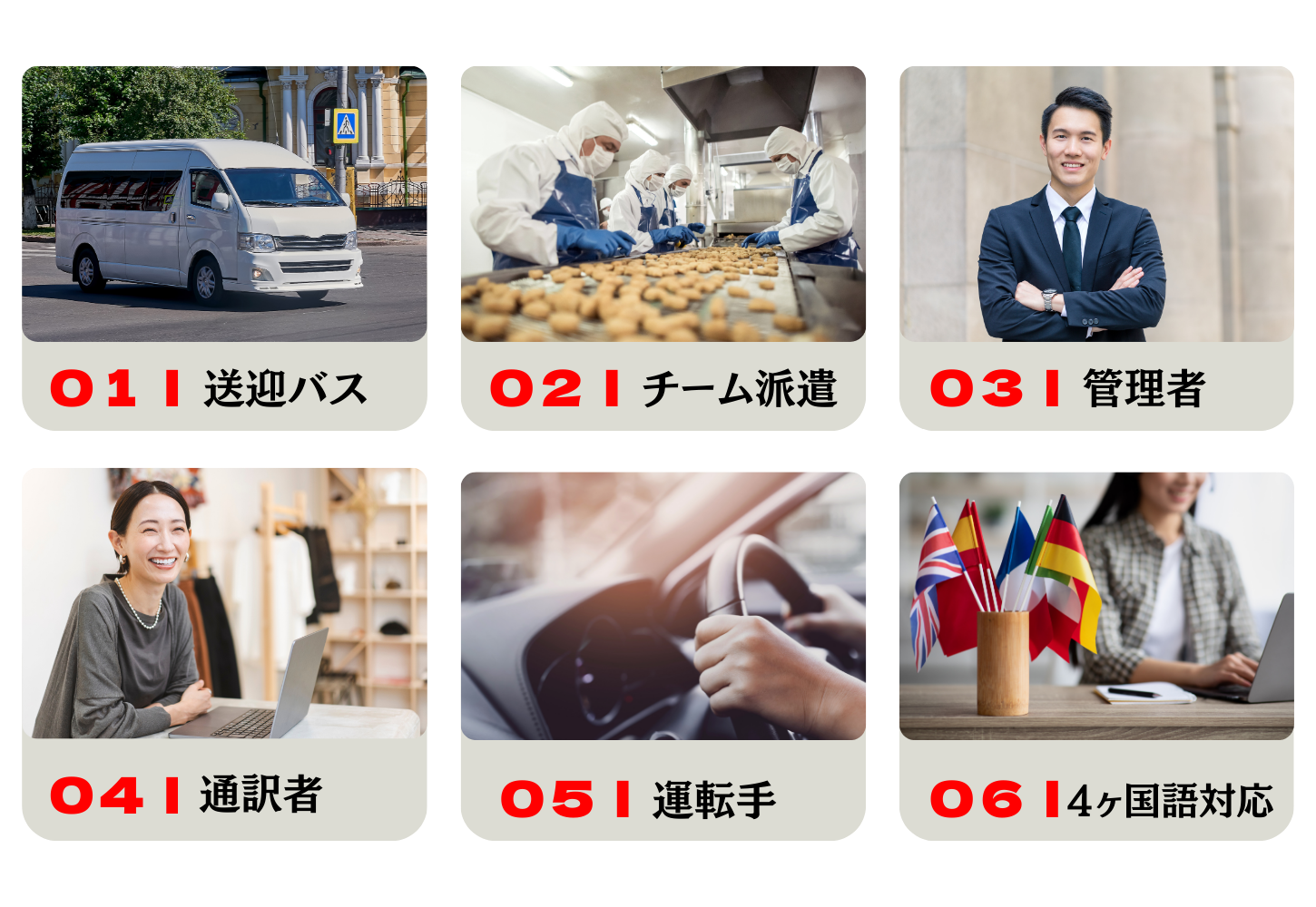 | 事業内容 | ◎労働者派遣事業 ◎業務請負事業 ◎人材紹介事業 ◎技能実習生受け入れ事業 ◎生前整理・遺品整理事業 |